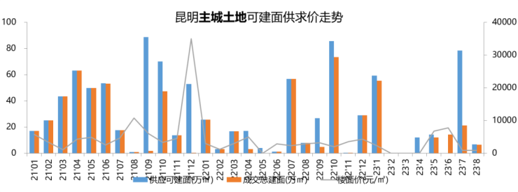 8月昆明主城1宗西山福海街道26.8亩居住用地出让,为原云报华府调规后地块;9.20拍卖;呈贡一宗21.55亩商业用地成交,由昆明市呈贡区花卉产业有限公司底价获取;流拍2宗经开区果林片区居住、住兼商用地,总面积167.81亩。郊县安宁新供1宗商业用地位于县街街道,无土地成交。