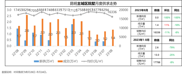 全国8月1日-26日一线、三四线成交量皆环比下跌,二线代表城市整体环比上涨,可能与政策利好和已然下跌的房价有关。昆明8月成交量预估环比持平,走势与全国基本保持一致。后续市场是否还能保持稳定的成交量,还需持续观察。另,中央8月提出存量房贷利率下降、认房不认贷等政策措施还需地方进一步落实。