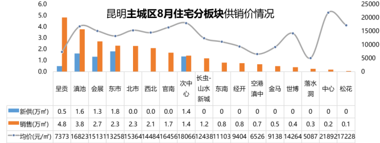 东市、滇池、次中心、会展和呈贡板块有供应;成交集中在呈贡、滇池和会展板块;中心和次中心板块均价居高。