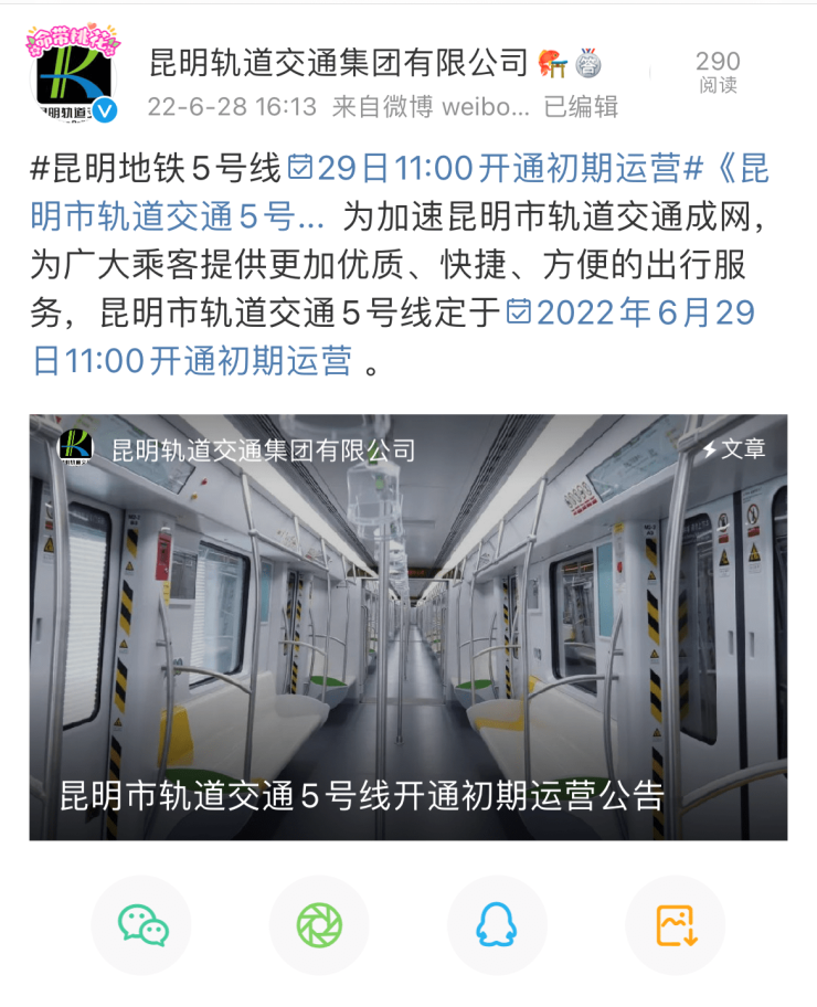 昆明地铁官微【昆明轨道交通集团有限公司】发布微博:昆明地铁5号线将于2022年6月29日11:00开通初期运营。