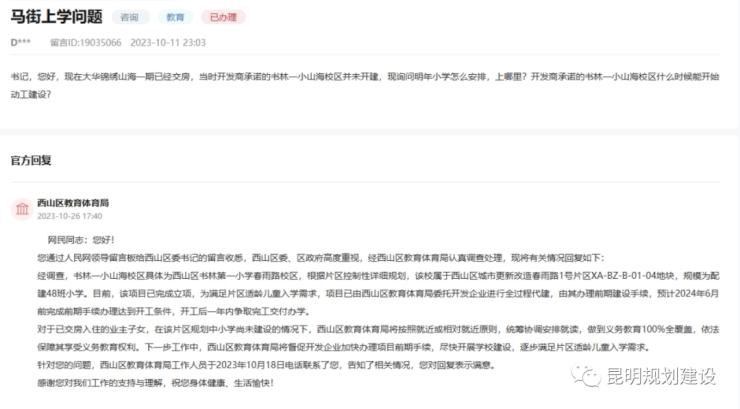 下一步工作中,西山区教育体育局将督促开发企业加快办理项目前期手续,尽快开展学校建设,逐步满足片区适龄儿童入学需求。