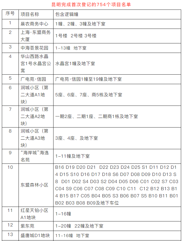 此次公示的项目是第九批公示的基础上,新增了包括昆明万达城、紫曼园、昆铁盛和家苑、欣都龙城等66个新建商品房项目。在此次公示范围内的项目,购房人可持相关资料自行向不动产登记机构申请办理不动产证。