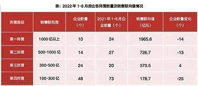 具体来看,千亿以上阵营10家,较去年同期减少14家,销售额均值1965.6亿元。第二阵营(500亿-1000亿)企业14家,较去年同期减少13家,销售额均值726.7亿元。第三阵营(300亿-500亿)企业24家,较去年同期微增4家,销售额均值373.5亿元。第四阵营(100亿-300亿)企业为48家,较去年同期减少25家,销售额均值178.7亿元。
