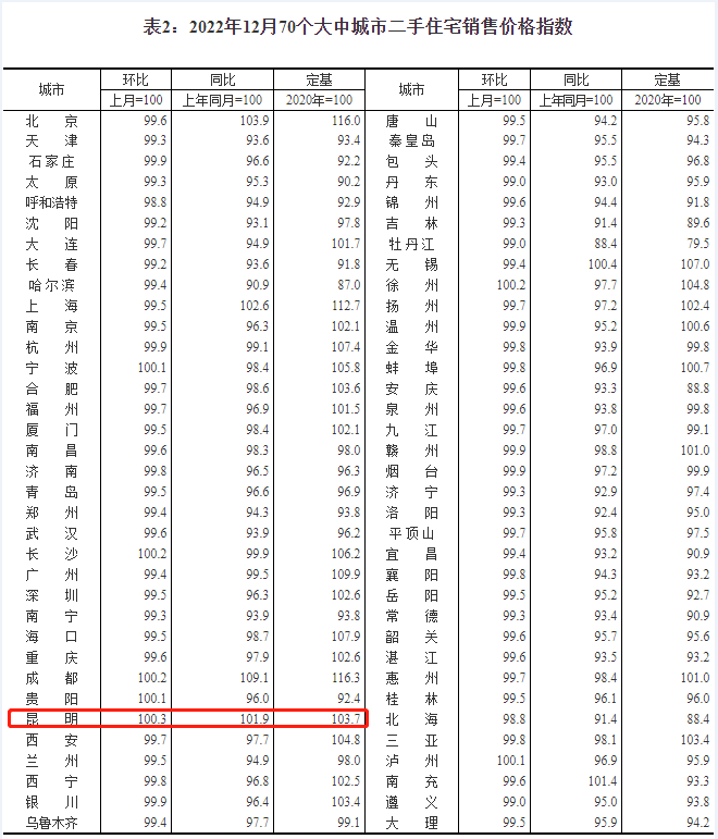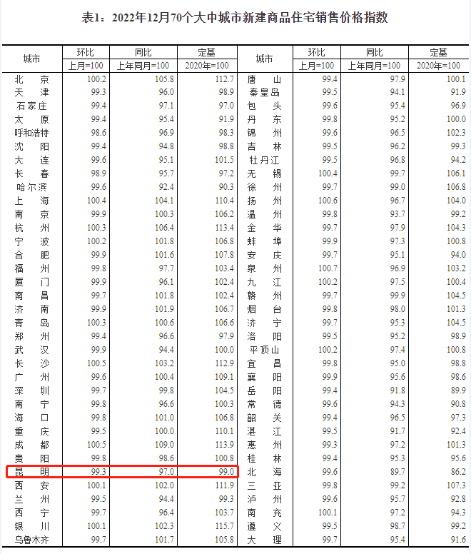 数据显示:2022年12月,昆明新房价格环比下跌0.7%、同比下跌3%,二手房价格环比上涨0.3%、同比上涨1.9%。