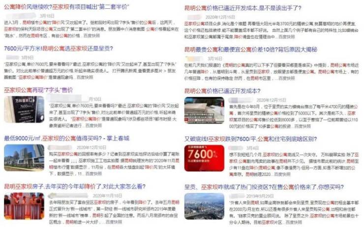 之前备受关注的巫家坝,大量公寓项目售价也从1万多的售价腰斩到5000多元,降价太猛以至于被央视报道。比如某际项目,单买一套34万,2套只要42万。“第2套半价”“50万两套”诸如此类的价格战持续发生。之前有媒体曾报道,昆明一女子豪掷1400万在巫家坝买了14套公寓。不到一年项目大降价,买家损失两三百万...