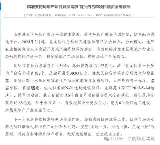 近日,盘龙区住建局发布消息,该区精准支持房地产项目融资需求,共有8个项目进入昆明首批“白名单”,融资需求全部获批,融资落地金额为10.68亿元,位于全市第一。