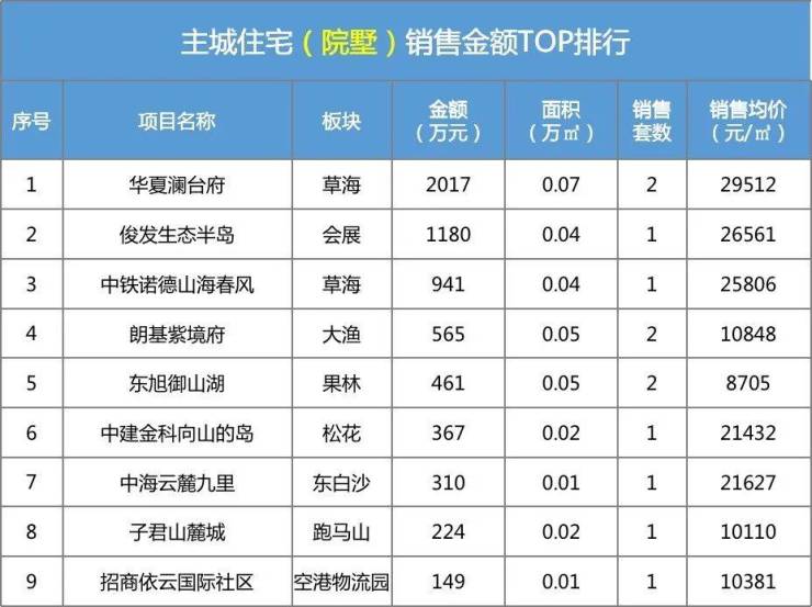 昆明主城住宅成交TOP排行(院墅)