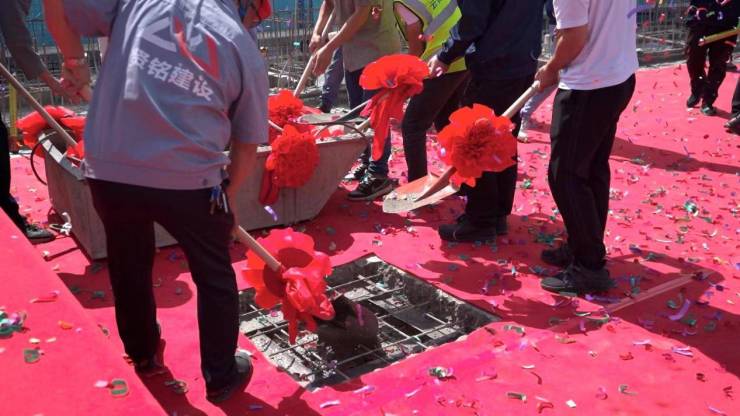 随后,在大家的阵阵掌声簇拥之下,在一声声礼炮齐向云霄的氛围中,活动迎来了高潮,各位领导及嘉宾一同走向台前,为楼栋填入最后一方水泥,宣告着5#楼的彻底封顶。仪式也在一片欢声笑语中圆满落幕,在主持人的邀请下,各位领导、嘉宾及施工团队一起合影留念,共同记录下这一荣耀时刻。
