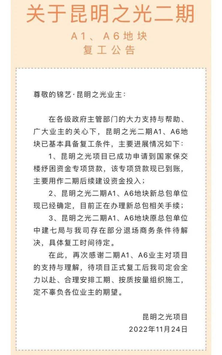 该公告还表示,待项目正式复工后,昆明之光项目定会全力以赴、合理安排工期、按质按量组织施工。