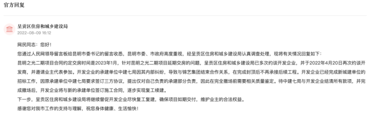 对此,呈贡区住房和城乡建设局8月9日回复称:昆明之光二期项目合同约定交房时间是2023年1月。针对该项目延期交房的问题,呈贡区住房和城乡建设局已多次约谈开发企业,并于2022年4月20日再次约谈开发商,并邀请业主代表参加。