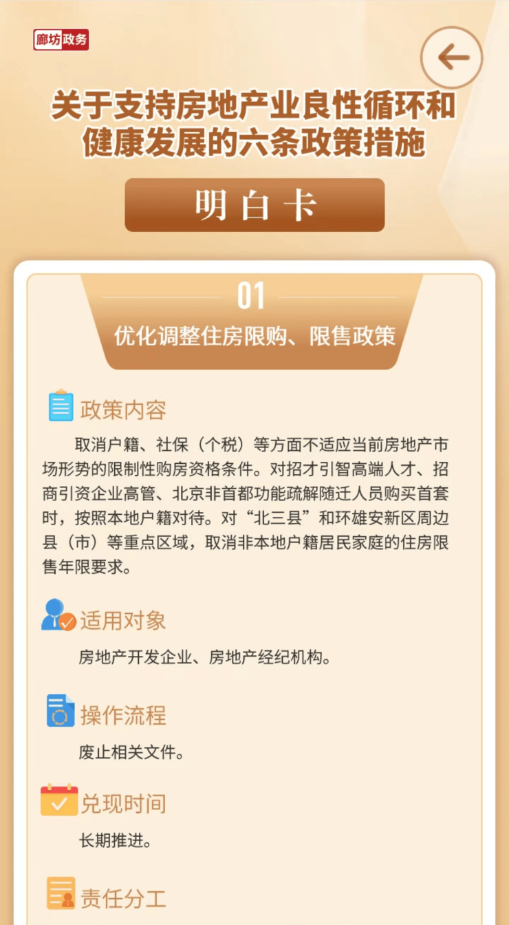 8月9日,澎湃新闻从河北省廊坊市人民政府官网获悉,《廊坊市扎实推动全市经济平稳健康发展的一揽子措施及配套政策明白卡》于近期发布。其中,《关于支持房地产业良性循环和健康发展的六条措施明白卡》显示,优化调整住房限购、限售政策,取消户籍、社保(个税)等不适应当前房地产市场形势的限制性购房条件。对招才引智高端人才、招商引资企业高管、北京非首都功能疏解随迁人员购买首套时,按照本地户籍对待。