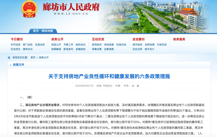在满足房地产业合理资金需求方面,明白卡新增“合理满足房地产开发企业开发贷款需求”。明白卡显示,银行业机构要按照依法合规、风险可控、商业可持续原则,区分优质项目和房地产企业集团风险,对风险可控、担保充分的项目给予开发贷款支持。做好重点房地产企业风险处置项目并购金融服务,重点支持优质房地产兼并收购出险和困难大型房地产的优质项目,合理确定融资期限,提高融资效率。对兼收并购出险和困难房地产企业项目的并购贷款暂不纳入房地产贷款集中度管理。加大对建筑企业流动资金贷款投放力度。值得一提的是,廊坊市政府曾于今年6月17日发布《关于支持房地产业良性循环和健康发展的六条政策措施》,不过彼时政策措施仅显示五条,排名前列条显示“(略)”。按照上述《政策措施》,在满足房地产业合理资金需求中提出,对符合条件的个人住房按揭贷款加大投放力度,及时满足融资需求。合理确定并推进落实商业性个人住房贷款较低首付比例;对于贷款购买普通自住房的居民家庭,首套住房商业性个人住房贷款利率下限调整为不低于相应期限贷款市场报价利率减20个基点,力争2022年8月份全市新发放个人住房贷款加权平均利率较4月份下降30个基点;二套住房商业性个人住房贷款利率政策下限按现行规定执行。