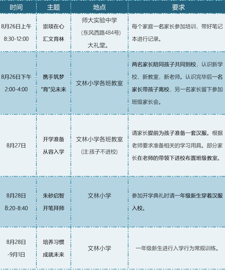8月28日、29日、31日晚上,将组织一年级新生家长培训会,具体要求由各班主任在班级微信群通知安排。