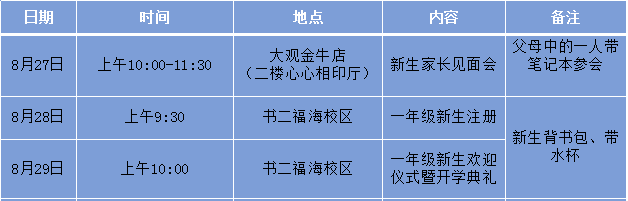 一年级注册时间:8月26日(周六)8:10,每名学生请一位家长到学校参加“大观小学家长学校”集中培训,培训后回到各班注册(学生不进校)。