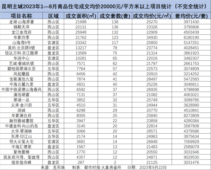 今年1—8月,昆明主城成交均价2万+的项目有哪些?这些项目的这类产品卖得怎么样?都市时报·大象房鉴所记者进行了整理。