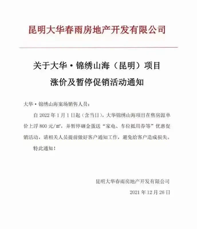 12月26日,大华·锦绣山海(昆明)项目发布涨价及暂停促销活动通知,显示自2022年1月1日起(含当日),大华锦绣山海项目在售房源单价上浮800元/平方米,并暂停“砸金蛋送家电、车位抵用券”等优惠促销活动。