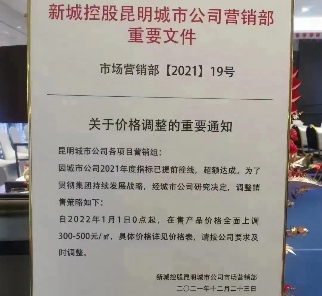 12月23日,新城控股昆明城市公司营销部发布通知,称“城市公司2021年度指标已提前撞线,超额达成”。
