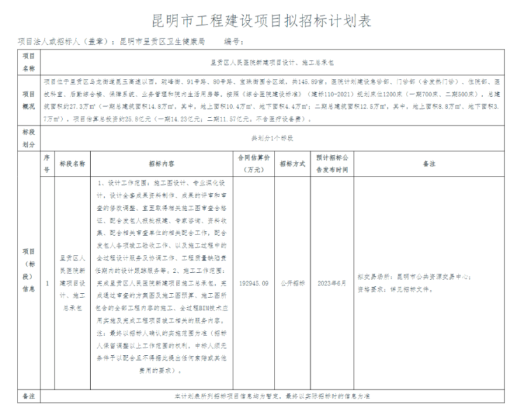 此次发布的呈贡区人民医院新建项目设计、施工总承包招标内容: