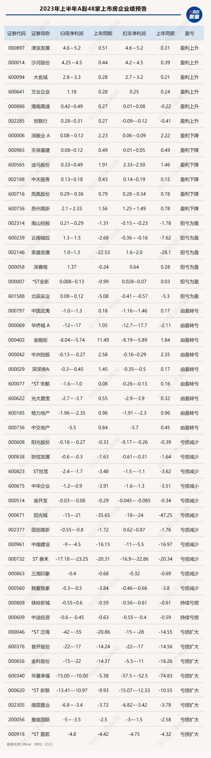 据Wind统计,截至7月18日,已有48家A股涉房企业发布2023年中期业绩预告或业绩快报。其中,有18家房企预计盈利,其中6家房企盈利同比上升,6家房企盈利同比下降,6家房企扭亏为盈;30家房企归母净利润预计亏损,其中有9家房企同比由盈转亏,11家房企亏损同比减少,8家房企亏损同比进一步扩大。