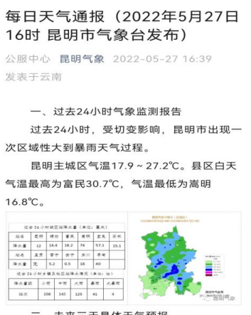 2022年5月26日,接气象局预警,5月28日昆明主城区将出现阵雨天气。