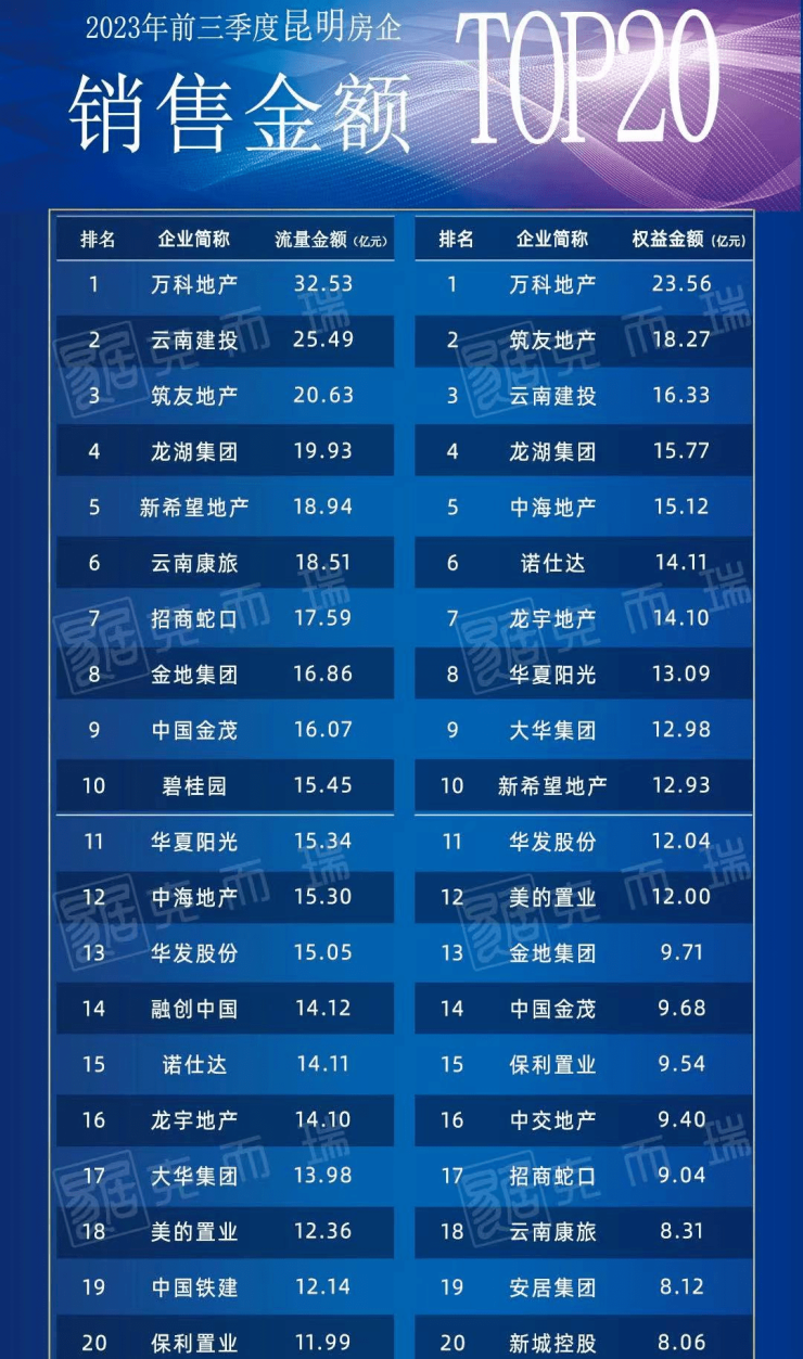 9月30日,克而瑞云南发布了2023年前三季度昆明房地产市场盘点报告。今年前三季度,昆明排名前20位的房企流量金额340.49亿元,同比下降22%。上榜的房地产企业中,有60%为国企、央企。