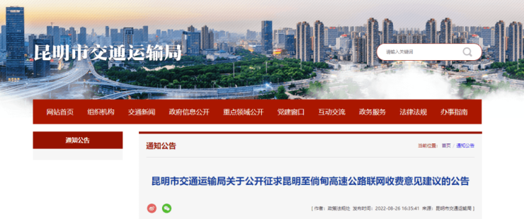 日前,昆明市交通运输局发布《关于公开征求昆明至倘甸高速公路联网收费意见建议的公告》(以下简称《公告》),公开向社会征求对昆倘高速公路联网收费的意见和建议。