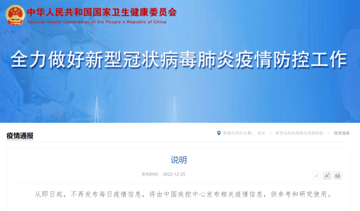今早(12月25日),国家卫健委官方网站发布说明:从即日起,不再发布每日疫情信息,将由中国疾控中心发布相关疫情信息,供参考和研究使用。