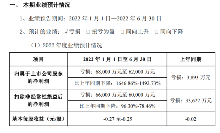 7月15日,美邦服饰发布2022年半年度业绩预告,预计归母净利润亏损6.8亿元至6.2亿元,归母净利润同比下滑1646.86%-1492.73%。
