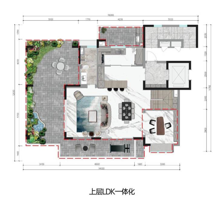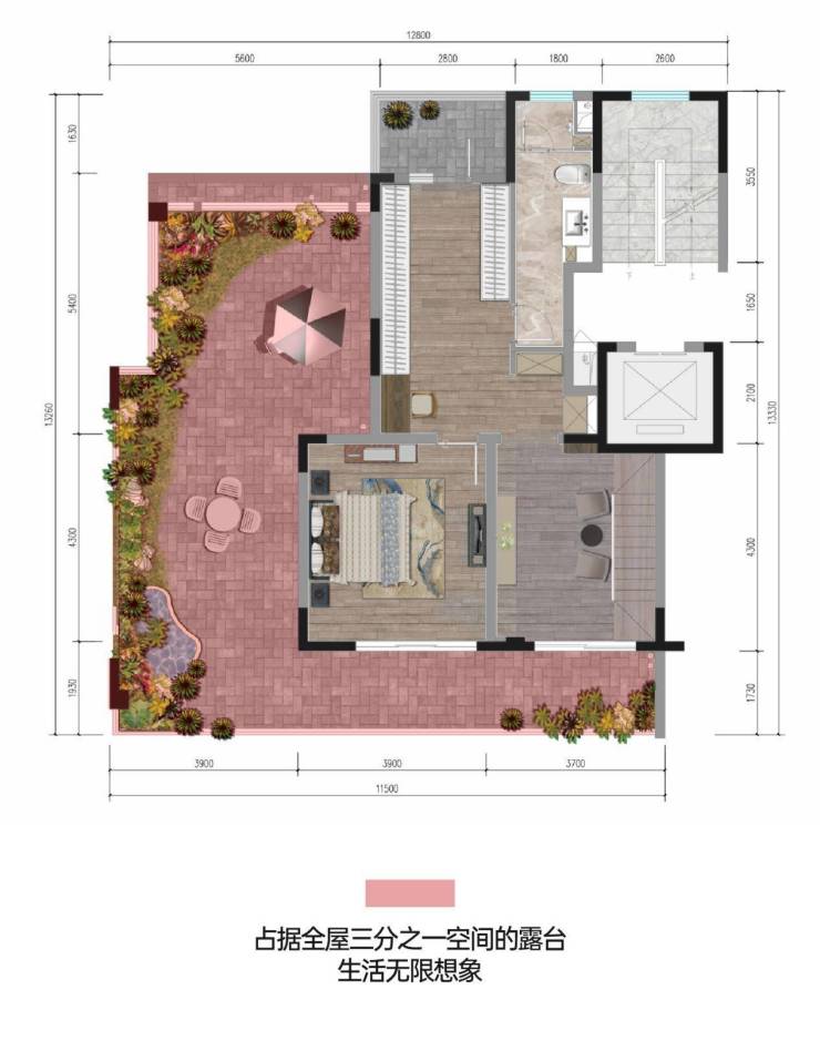 建筑面积约220㎡户型,5卧3厅3卫4阳台设计,上层LDKG一体化,U型270°花园露台不仅提供辽阔的观滇视野,展现优于普通平层的采光,更延伸出独立的意趣空间,形成一条家的洄游动线。