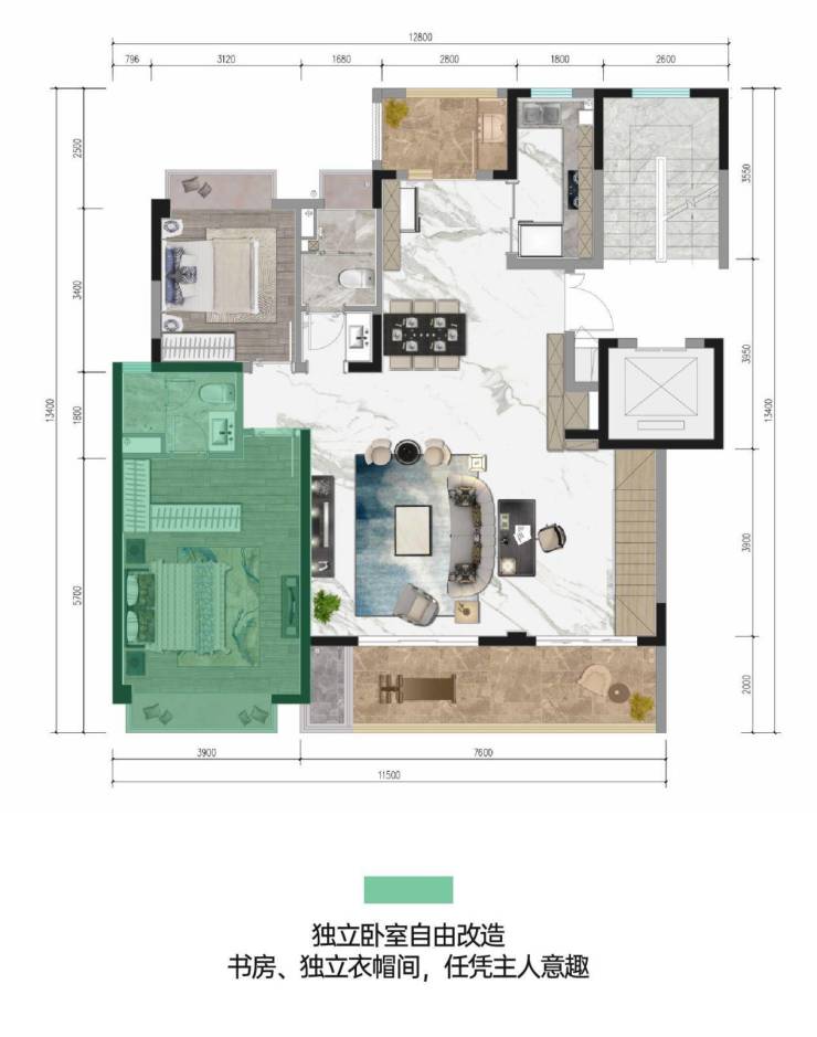 下层双间主卧式设计,每个人都能找到自己的位置,规避传统平层空间中彼此迁就彼此成全的局促感,相比大平层产品,更为高净值人群所需要的私享空间,提供了适当的保留。