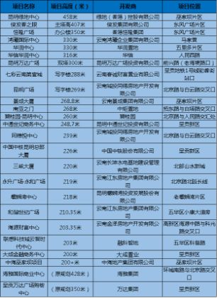 包括2011年建成的168米南亚风情第壹城写字楼A座、120米南亚风情第壹城写字楼B座;2012年建成的103米和谐世纪广场、219米昆钢科技大厦;2013年建成的129米天宇花园、171米金平果国际商务大厦、139米南亚之门公寓和199米世纪中心。