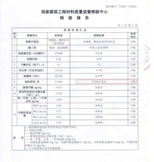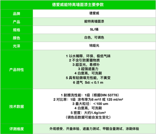 好的墙面漆一定是满足健康环保的要求,墙面乳胶漆中VOC的含量是消费者最关注的指标之一。中国的《室内装饰装修材料内墙涂料中有害物质限量》规定:墙面漆中的VOC含量须≤120克/升;环境标志认证标准也要求墙面漆除水后的VOC含量要≤50克/升;能特高桶身背后印有德国欧盟VOC排放标准,标准规定每升不得高于30g,而这款产品的VOC则低于1克/L,远低于国标标准,几近零释放。