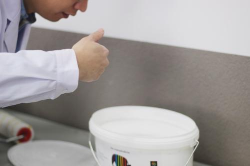 墙面乳胶漆环保性能的高低,是可以“闻”出来的。我们凑近涂料细闻,完全没有嗅到任何刺激性气味,开盖之后实验室内的空气依旧清新,用户是可以放心使用的。