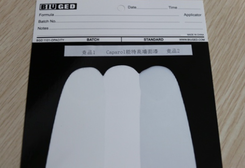 我们参照国家标准,使用100微米的线棒,将涂料均匀的涂在黑白纸卡上,观察不同的涂料在黑色及白色面上的遮盖力。从卡片中我们可以非常明显的看到,中间部分的Caparol德爱威能特高墙面漆的覆盖力明显优于两侧的其他品牌涂料,并且是将黑色完全覆盖住的。小编不禁试想,有了Caparol德爱威能特高墙面漆,家里年久有污渍甚至发黄的老墙就能轻松焕新了!