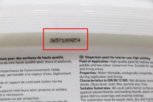 E.L.F.是德国水性涂料高环保要求的标志;为德语EmissionminimiertLoesemittelfrei的缩写,意为不含溶剂及挥发性物质;E.L.F.的标准要求VOC较大限量为1g/L,其标准不低于德国蓝天使的要求; 4) 德国原产生产批号:其中包含涂料的生产日期和生产批号
