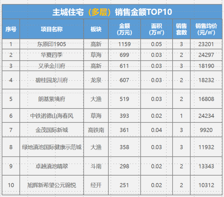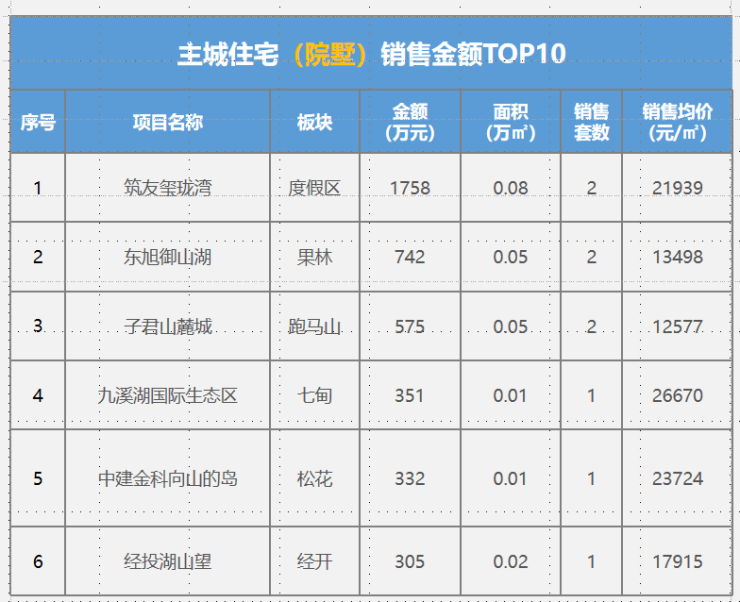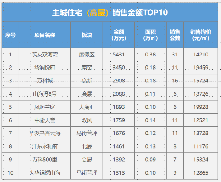 本周住宅成交4.98万㎡,环比下降2%。主力成交项目为筑友双河湾31套,0.38万㎡;华润悦府11套,0.18万㎡;万科城16套,0.18万㎡等 ;