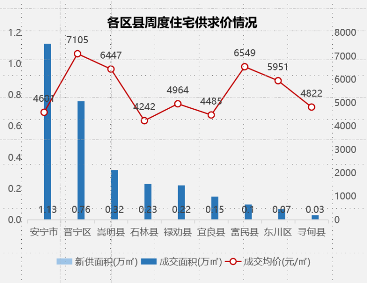 本周郊县无项目供应;成交以安宁、晋宁和嵩明为主;晋宁均价最高。