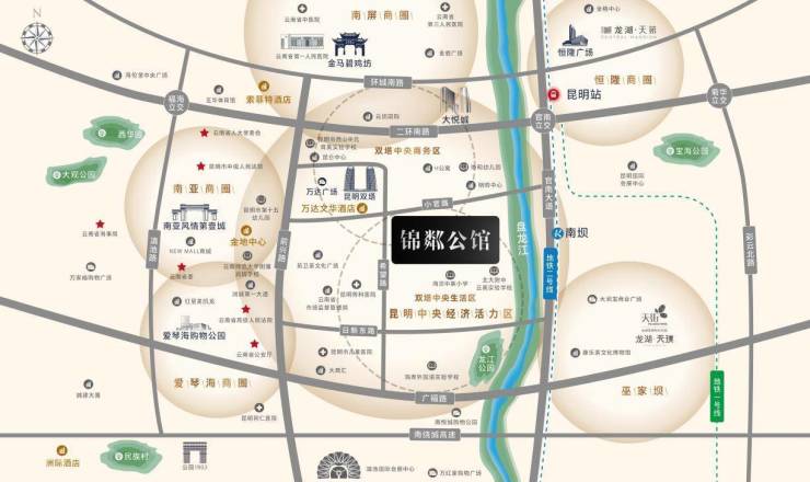 项目紧邻二环南路、官南大道、广福路以及前兴路形成的四横四纵城市主干道,快速接驳四大主城区。龙江公园以及盘龙江“穿城而过”,呈现至美的生态大境。周边万达广场、大悦城、爱琴海购物公园、南亚风情第壹城、恒隆广场五大旗舰商业汇聚。北清实验小学、海贝中英小学、昆明市第十五中、书林一小(在建中)等优质学府环伺。