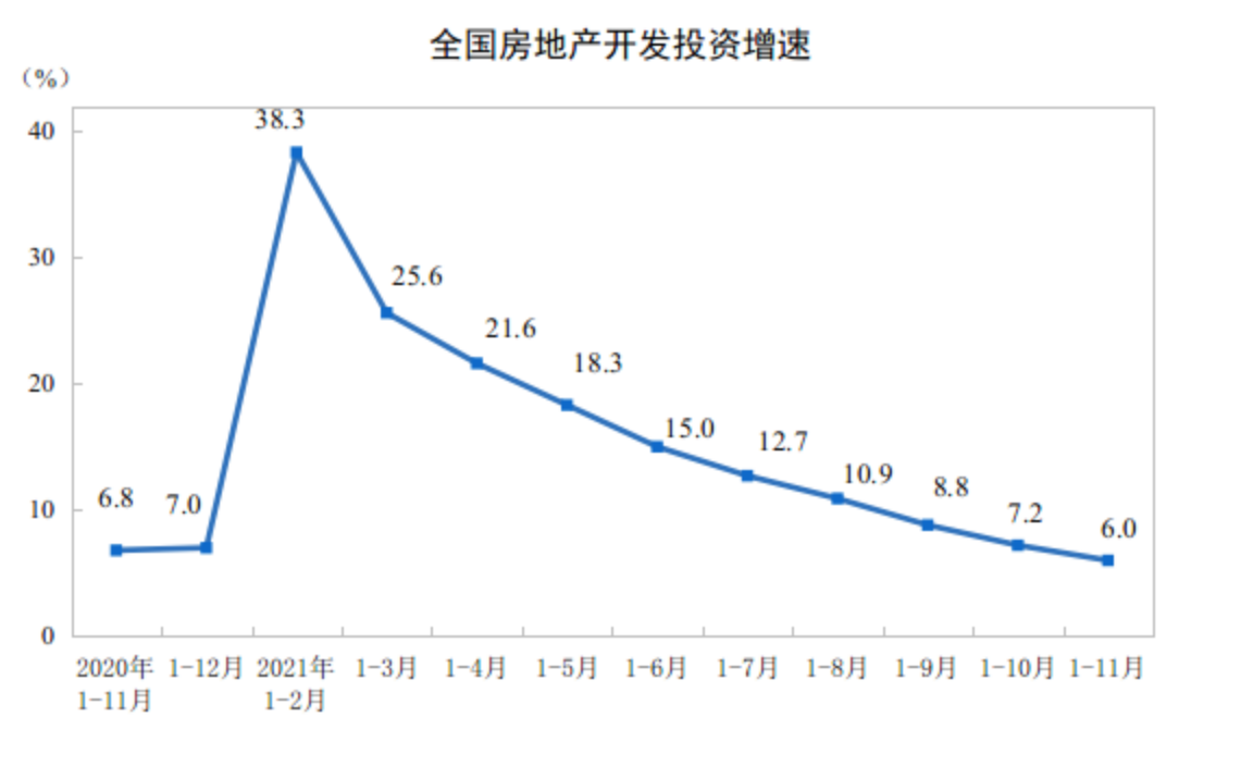 国家统计局数据显示,1—11月份,全国房地产开发投资137314亿元,同比增长6.0%;比2019年1—11月份增长13.2%,两年平均增长6.4%。其中,住宅投资103587亿元,增长8.1%。至此,房地产开发投资增速自今年3月起已连续9个月收窄。