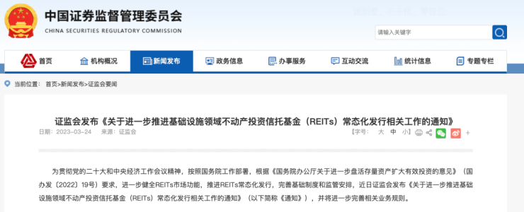 3月24日,证监会发布《关于进一步推进基础设施领域不动产投资信托基金(REITs)常态化发行相关工作的通知》(以下简称《通知》);同日,国家发改委发布《关于规范高效做好基础设施领域不动产投资信托基金(REITs)项目申报推荐工作的通知》。