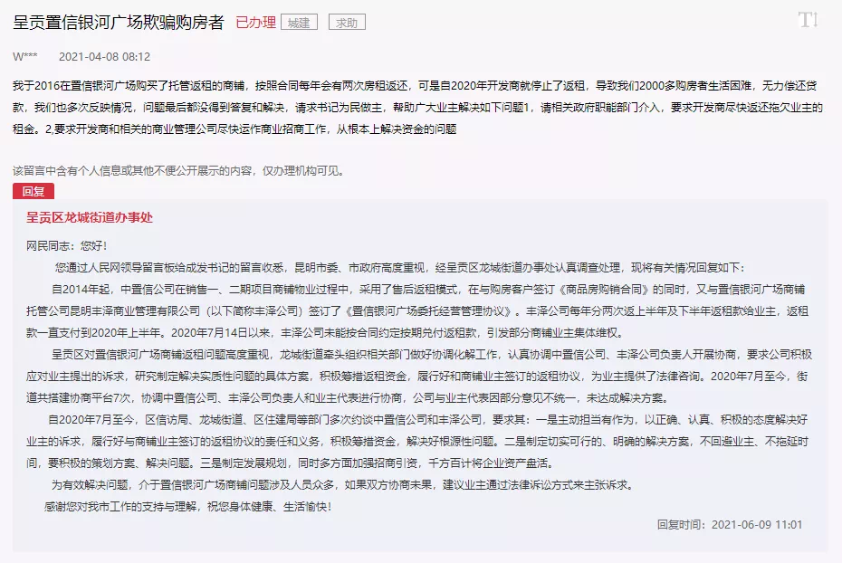 今年4月初,有业主在人民网地方领导留言板上留言,希望政府职能部门介入,要求开发商尽快返还拖欠业主的租金;并要求开发商和相关的商业管理公司尽快运作商业招商工作,从根本上解决资金问题。6月初,呈贡区龙城街道办事处回应称:2020年7月至今,街道先后7次协调中置信公司、丰泽公司负责人和业主代表进行协商,但公司与业主代表因部分意见不统一,未达成解决方案。