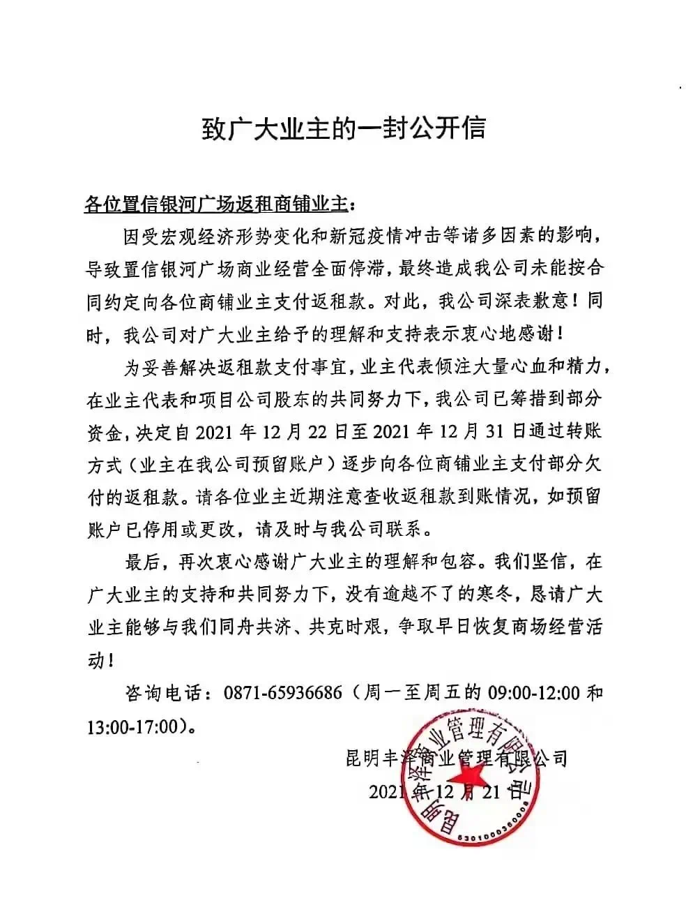 12月21日,呈贡置信银河广场的托管公司在置信银河广场公众号上发布了一封致业主的公开信。
