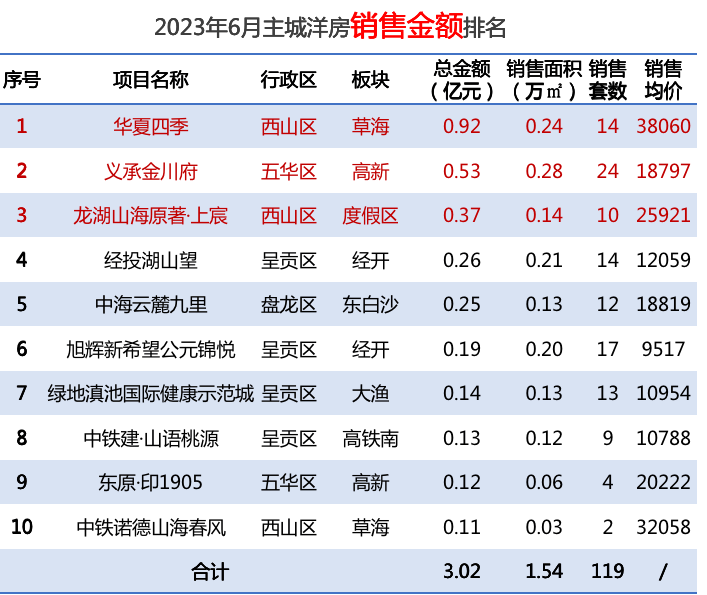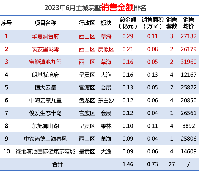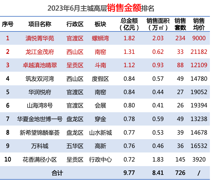 6月主打价格和优惠措施项目排名靠前,包含滇悦菁华苑、龙江金茂府、卓越滇池晴翠等;低密类项目排名靠前项目仍集中在滇池度假区板块。