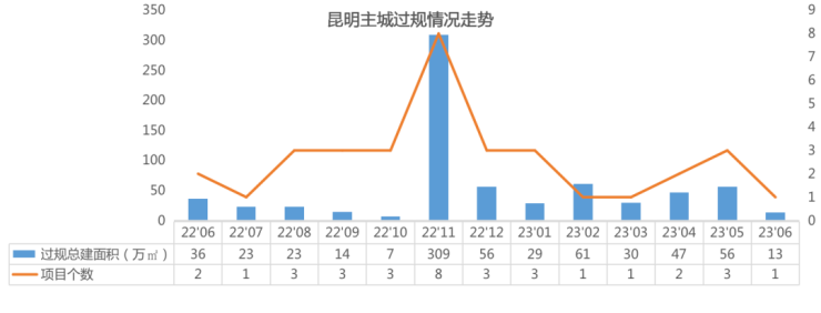 本月1个项目过规,过规总建面13.33万㎡,环比下降77%,同比去年6月下降64%。为官渡区方旺片区保利城项目商业地块,拟建4栋办公楼及两层商业裙房。